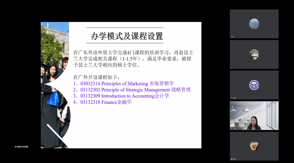 4月28日,太阳城国际项目中心面向大学城校区开展“太阳城娱乐城-昆士兰大学”硕士项目招生宣讲。宣讲会以线上线下结合的方式进行,国际项目中心丛瑾老师主持宣讲会。太阳城杨文慧副经理、曾成老师、韩金彪老师、感兴趣的同学参加宣讲会。
