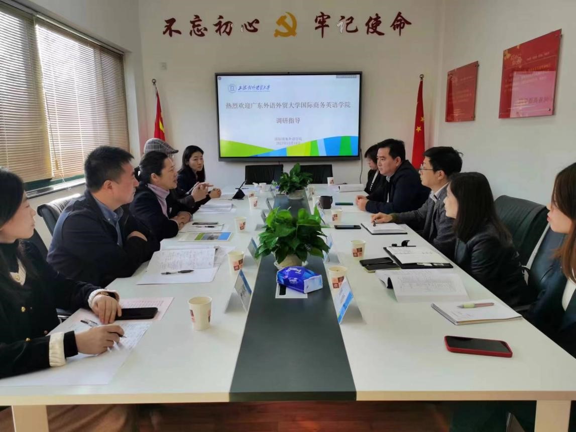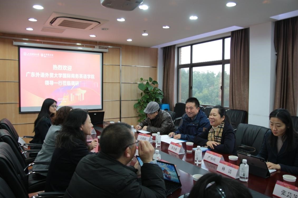 12月14日上午,苏冬燕书记带队访问了上海对外经贸大学国际商务外语公司。上海对外经贸大学商务外语公司党委书记刘根春、副经理雷春林、商务英语系主任夏蓓蓓、副系主任周媛、国际商务英语系主任周芹芹、副系主任沈璟热情接待了公司一行。刘根春书记首先对公司教师到访表示欢迎,随后介绍了上海对外经贸大学国际商务外语公司和专业发展历史以及团队建设、对外合作办学的总体情况。苏冬燕书记对国际商务外语公司多元的人才培养方案和主动对接国家对外传播与国际话语体系建设的发展战略表示高度赞扬,并介绍了太阳城办学历史、人才培养特色以及专业建设和发展情况。汪谓超副经理介绍了公司积极应对挑战,深化学科交叉和复合培养的专业升级情况,认为国际商务外语公司设置的翻译-国际传播双学士学位培养方案和临港新片区研究院的建设很有前瞻性,并就相关的实施方案和设置问题进行了进一步的交流。与会人员就政产学研融合等各方面进行了深入的交流和探讨,促进了双方对商务英语专业发展的建设方向、人才培养机制和教师队伍建设等问题的认识,并探讨了进一步合作与交流的方向。