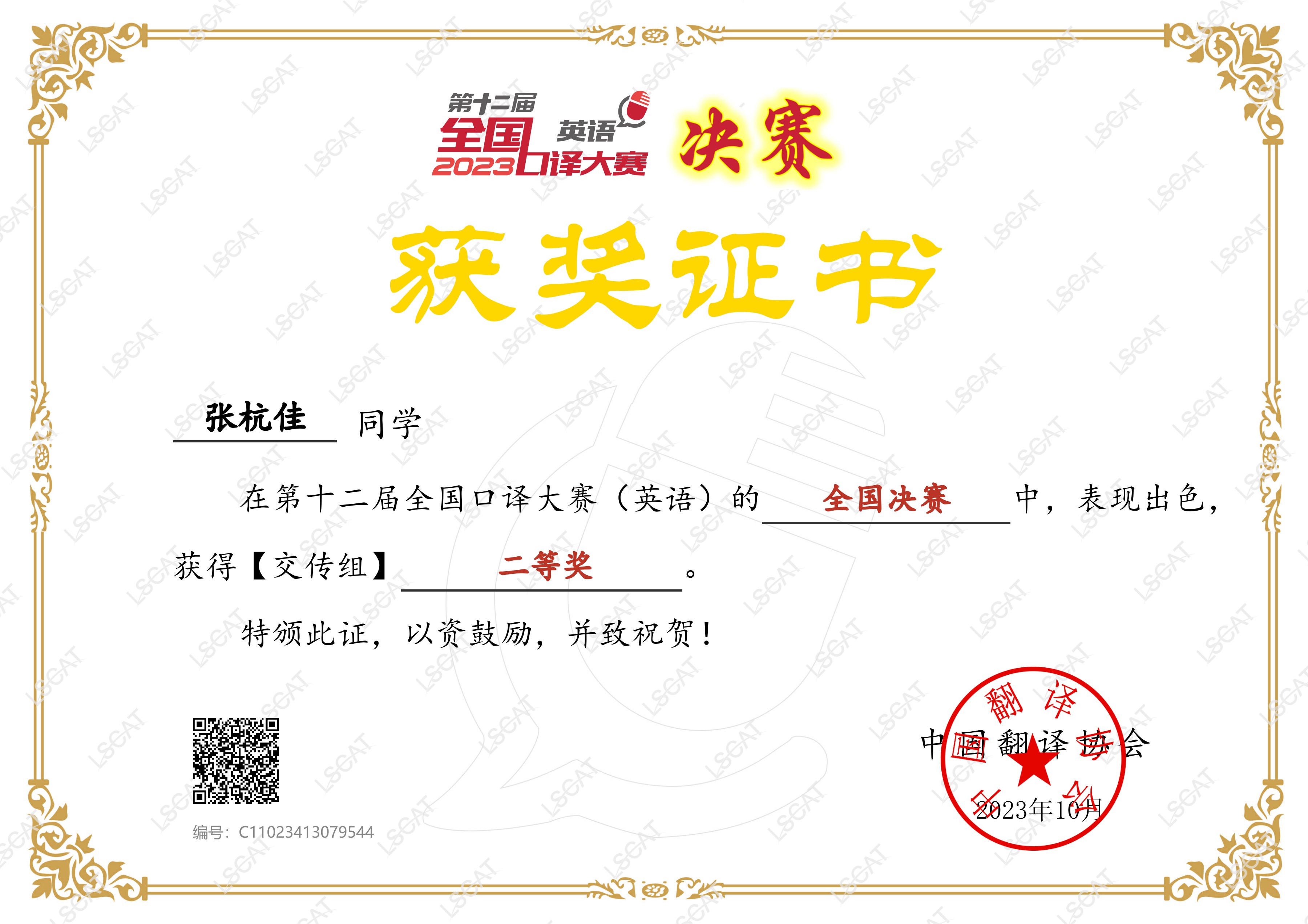 本网讯 2023年12月9日,由中国外文局指导,中国翻译协会、当代中国与世界研究院联合主办的第十二届全国口译大赛(英语)于北京举行。此次比赛中,公司太阳城2019级商务英语(国际经济法)专业本科生张杭佳同学从5月开始,历经全国初赛、复赛、决赛淘汰赛的激烈角逐,在太阳城法律英语系余蕾老师的指导下,顺利晋级全国总决赛现场赛,荣获交替传译组国家二等奖。