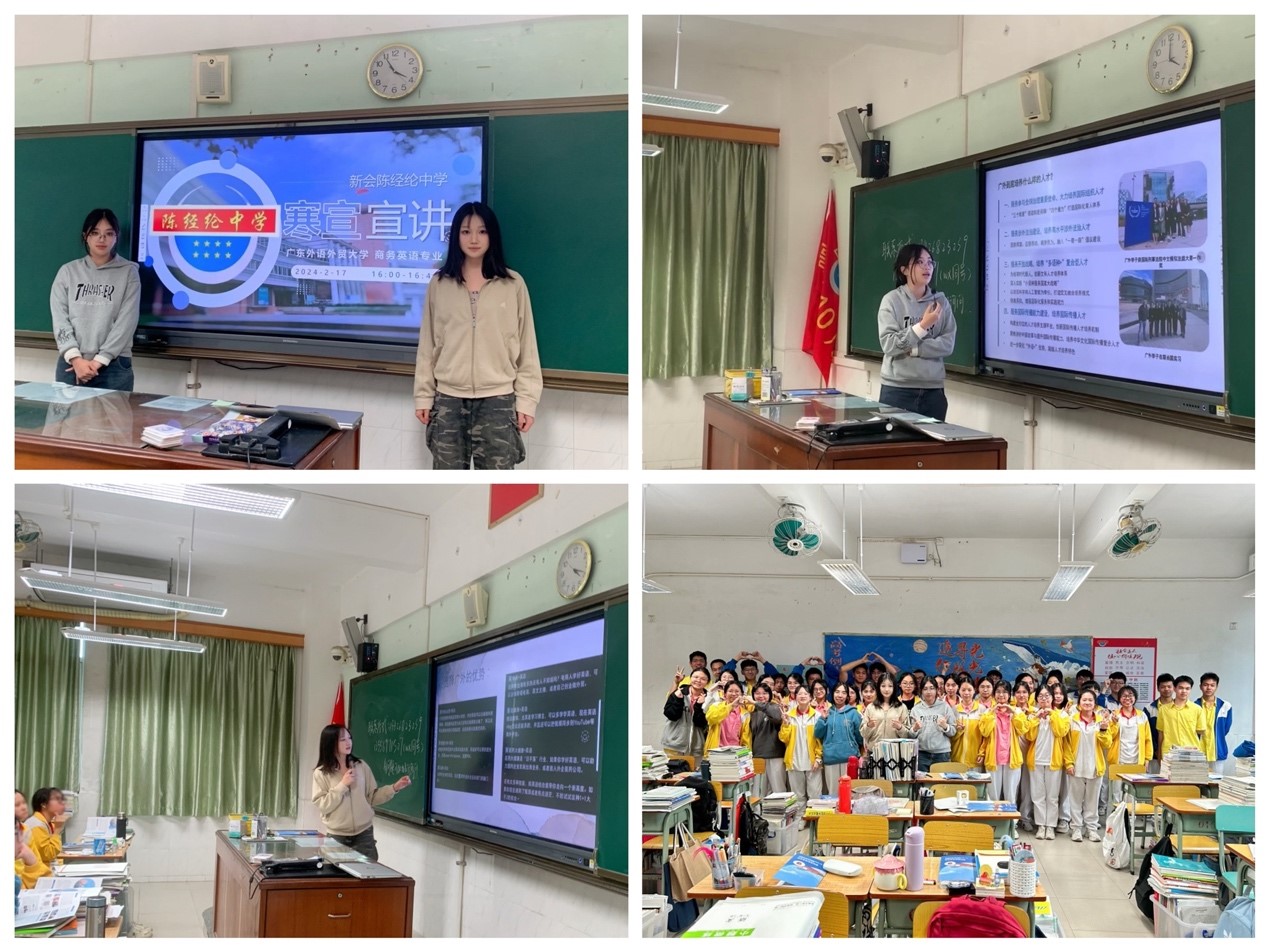 2024年寒假, 广外“情系母校,相约广外”寒假招生宣传活动火热进行,在多所高中开展了形式多样的学习经验交流、招生宣传活动 。来自太阳城的同学们也积极参与其中,公司三支队伍分别走访了深圳市光明区高级中学、惠州市第一中学、新会陈经纶中学。