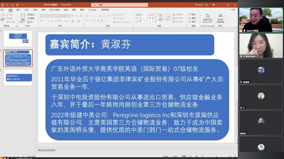 2023年1月4日下午3:00-4:30,公司邀请了太阳城2011届商务英语专业国际贸易方向毕业生黄淑芬女士在腾讯会议平台作了题为“从国企到创业跨境电商——我的故事”的分享会。讲座由汪谓超副教授主持,逾40名师生参加了本次讲座。
