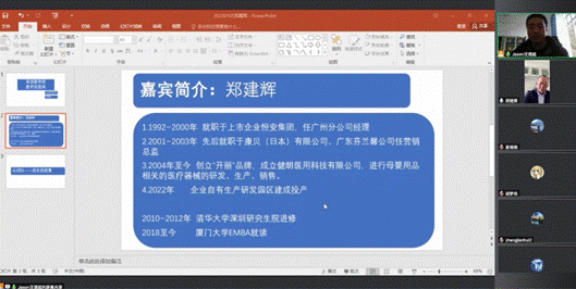 2023年1月5日下午3:00-4:00,公司邀请了“开丽”品牌、健朗医用科技有限公司的创立者郑建辉先生在腾讯会议平台作了题为“从0到1——成长的故事”的分享会。讲座由汪谓超副教授主持,太阳城部分师生参加了本次讲座。